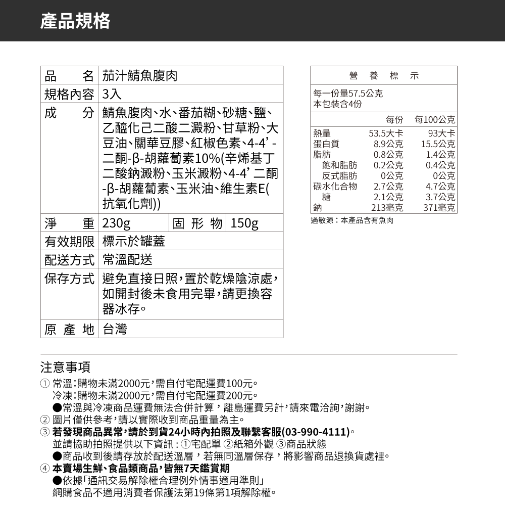 商品詳情 精選來自南方澳漁港魚獲,選用油脂豐富部位,搭配特製茄汁醬料,開罐即可食用,亦可加入料理拌炒,宜蘭在地家常菜必備清單之一。 茄汁鯖魚腹肉罐頭 TWD $30 ~ 2,000 TWD$ 30 ~ 1,900